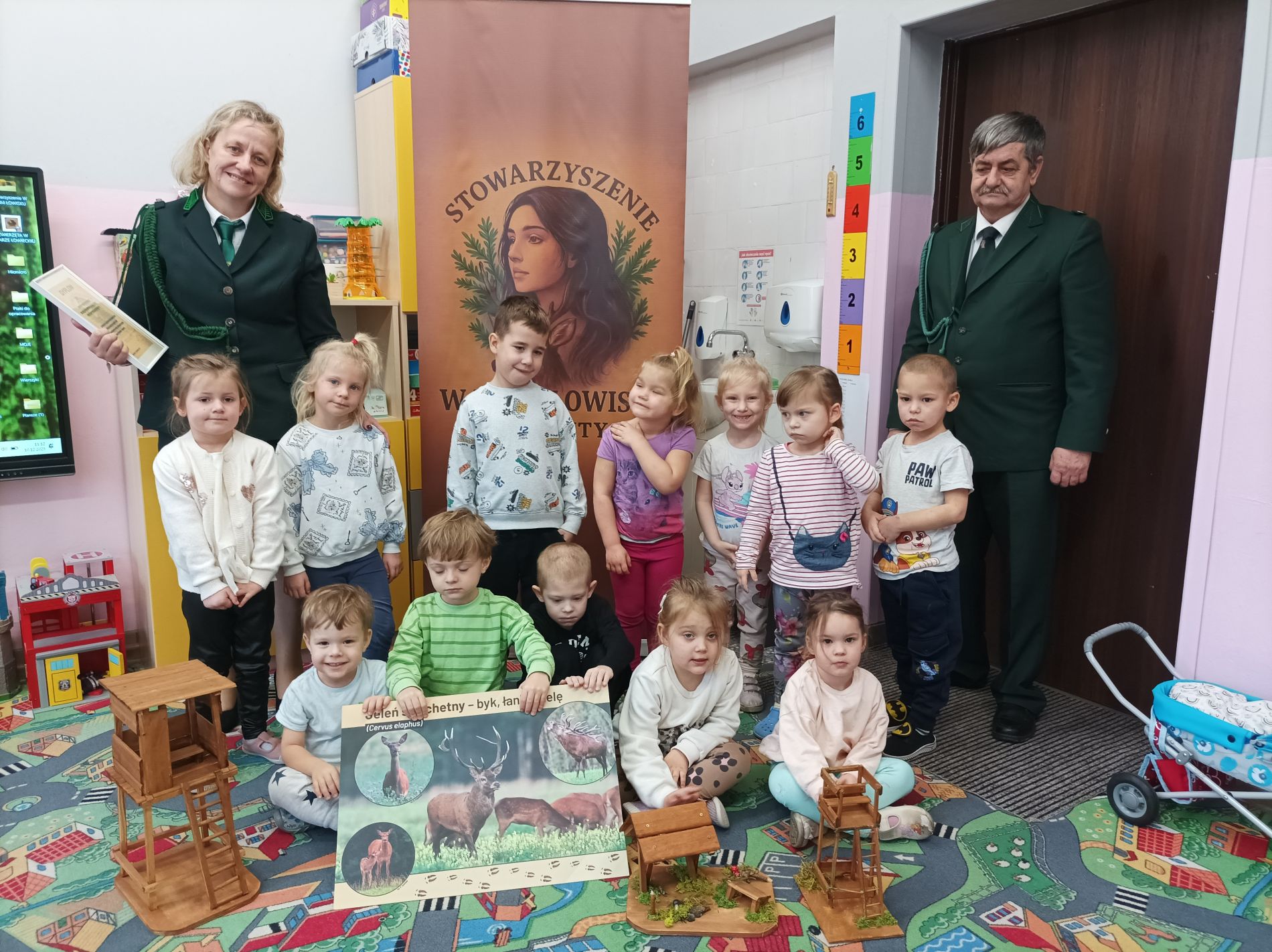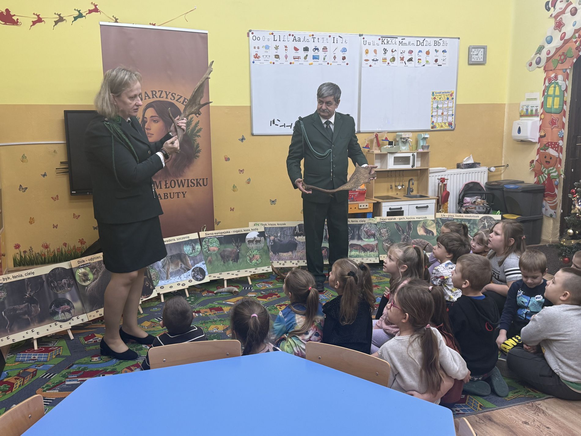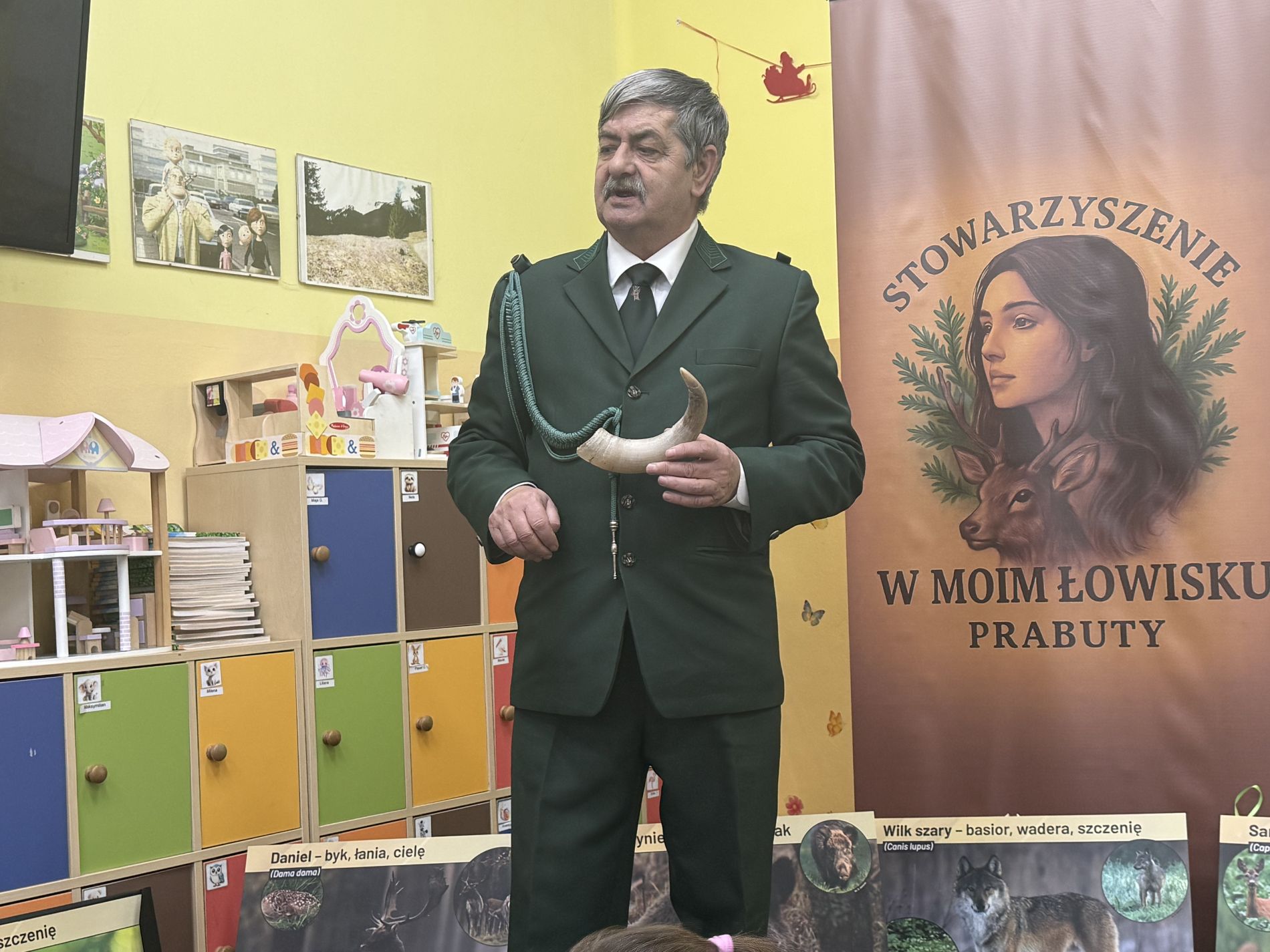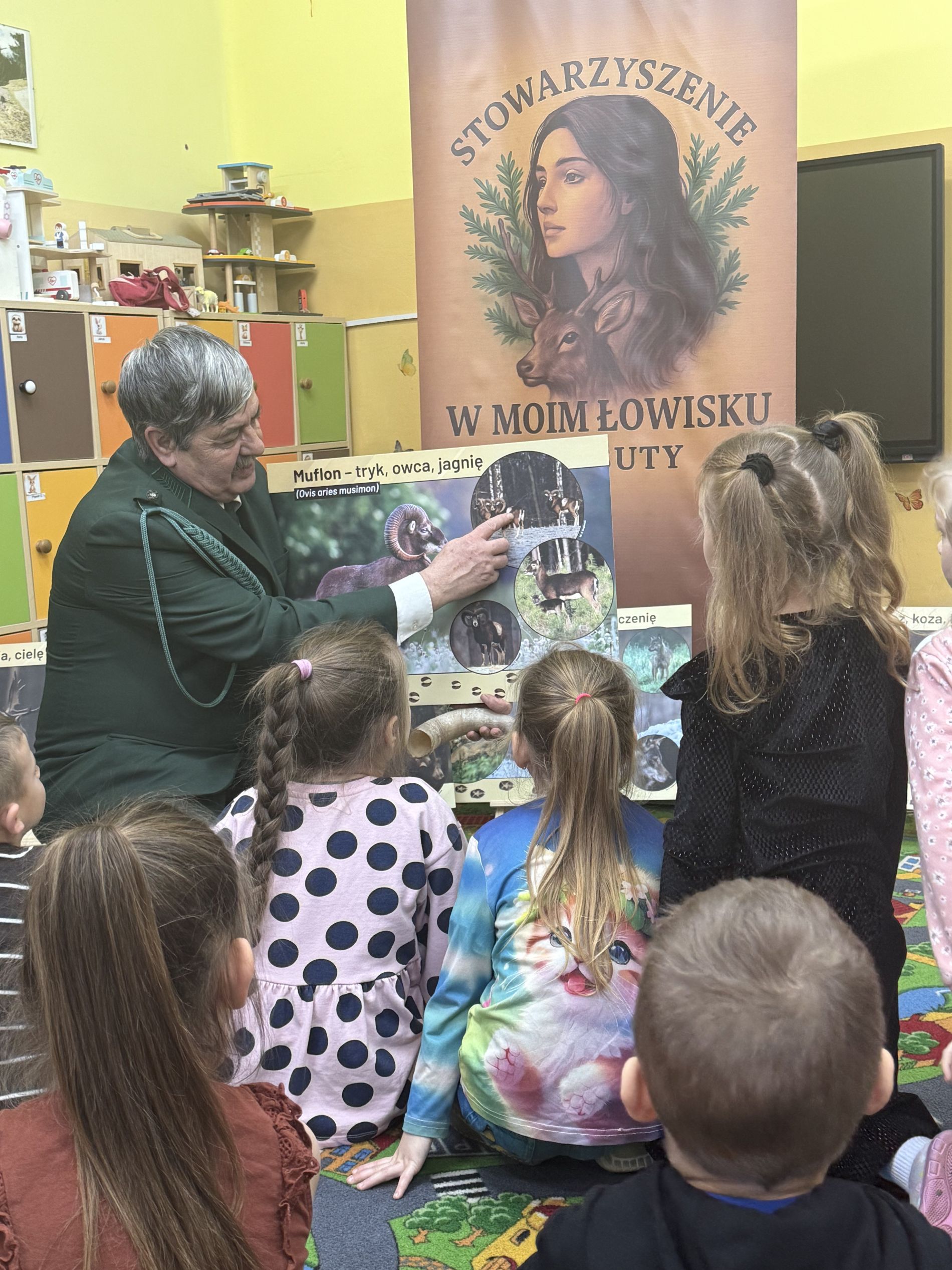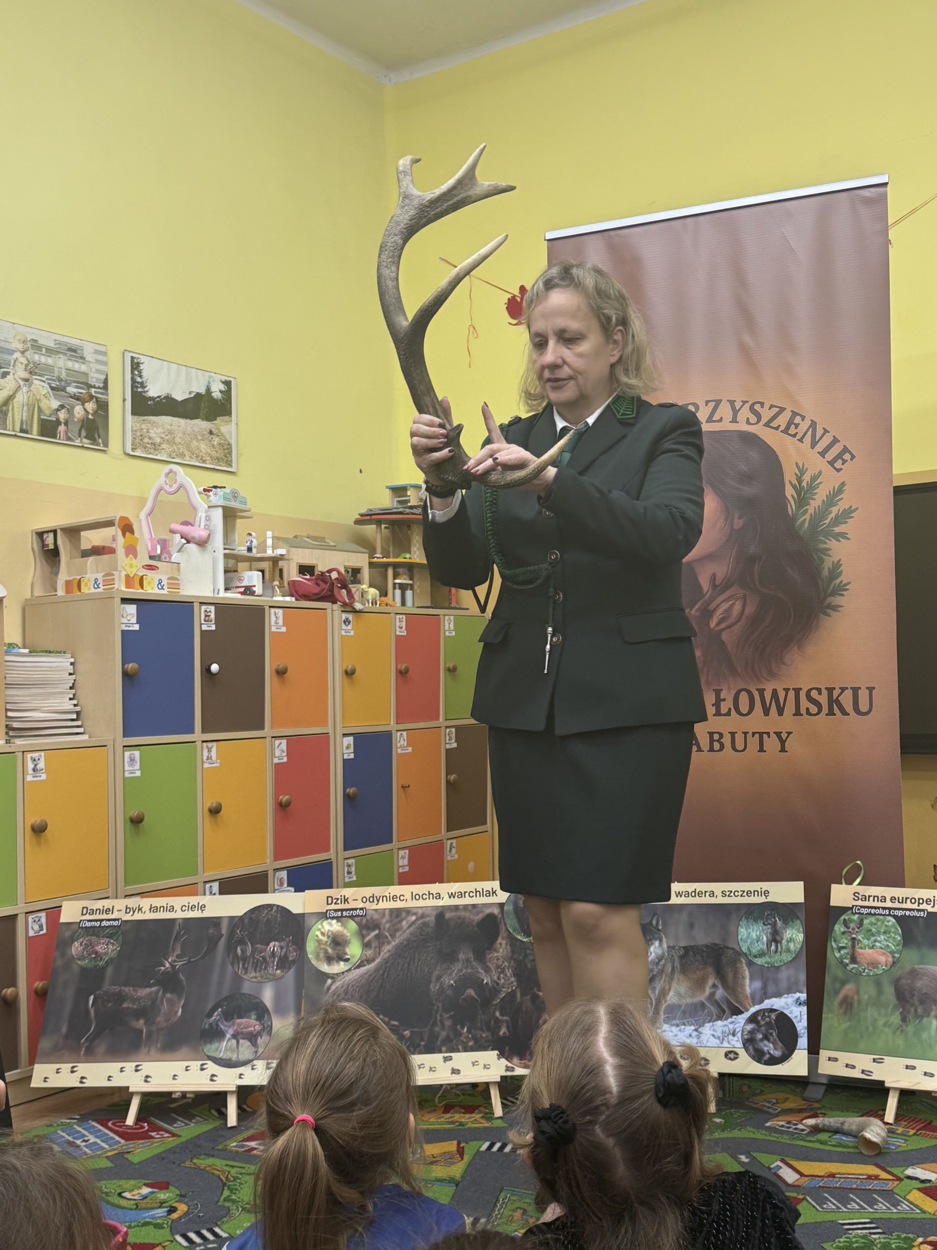 Podczas zajęć przedszkolaki oglądały plansze przedstawiające różne zwierzęta oraz słuchały interesujących opowieści na ich temat. Miały również okazję poznać poroża charakterystyczne dla poszczególnych gatunków i dowiedzieć się, jak je nazywamy. Dużą atrakcją było także obejrzenie miniatur ambon i paśnika, które wzbudziły wśród dzieci wiele zaciekawienia.