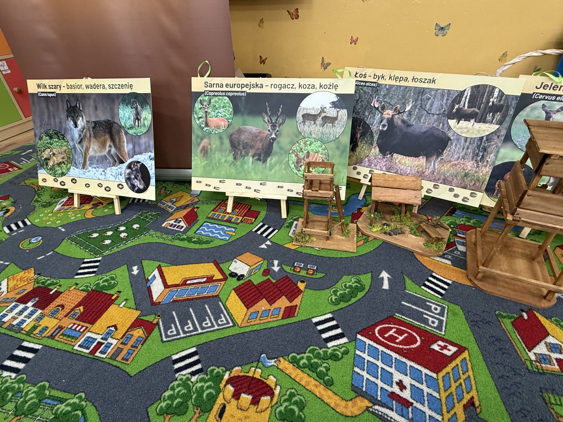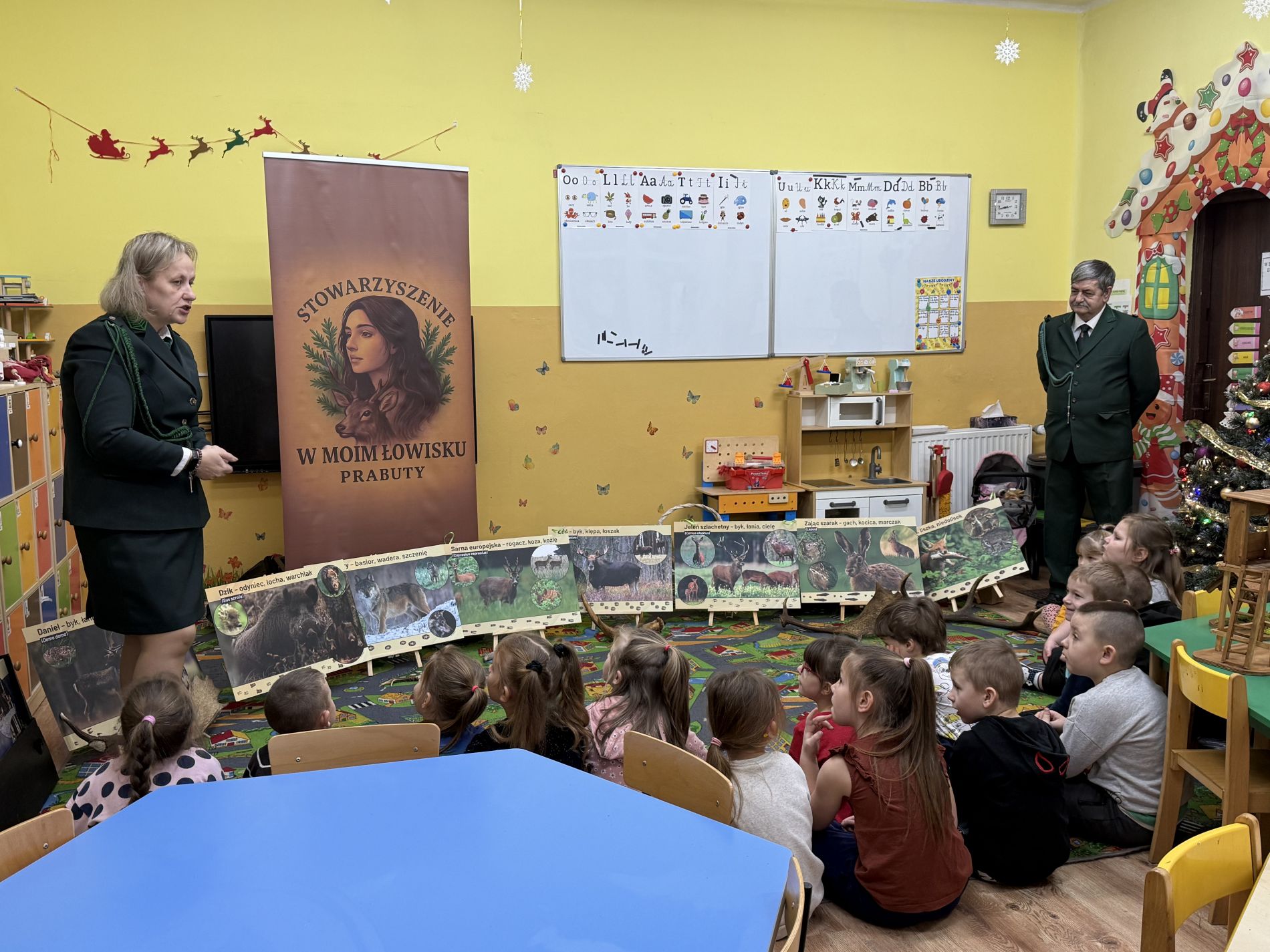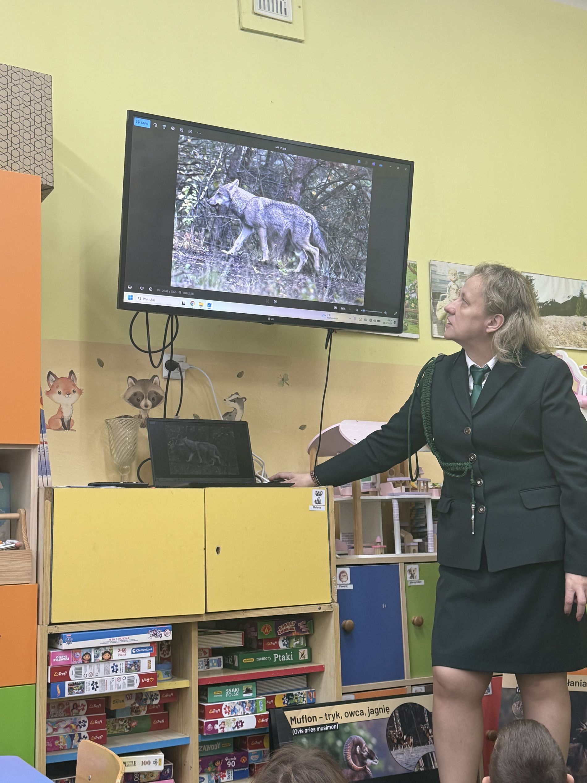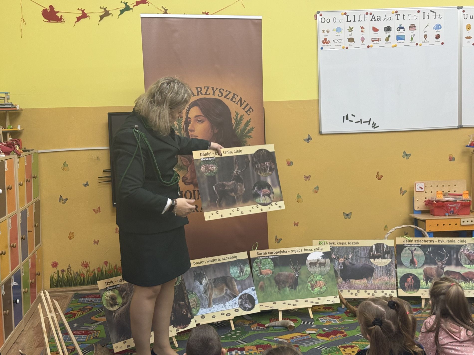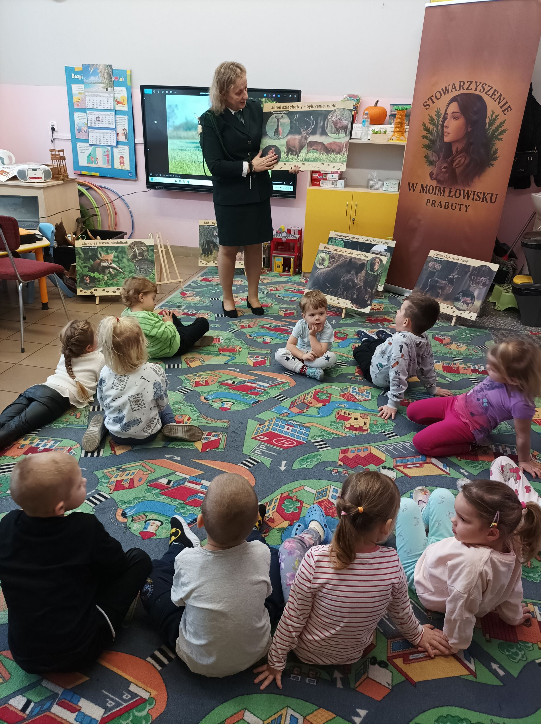 Podczas zajęć przedszkolaki oglądały plansze przedstawiające różne zwierzęta oraz słuchały interesujących opowieści na ich temat. Miały również okazję poznać poroża charakterystyczne dla poszczególnych gatunków i dowiedzieć się, jak je nazywamy. Dużą atrakcją było także obejrzenie miniatur ambon i paśnika, które wzbudziły wśród dzieci wiele zaciekawienia.