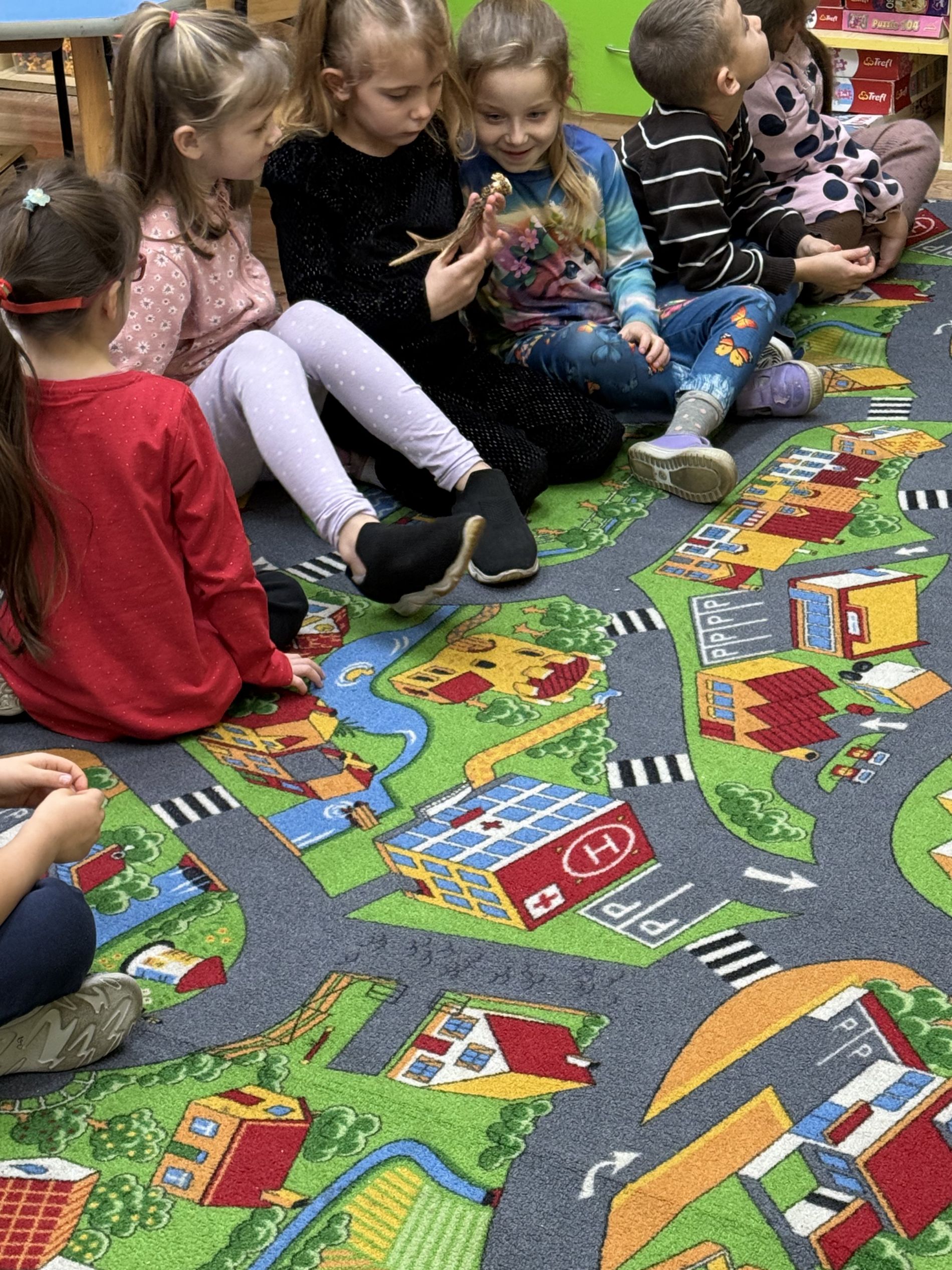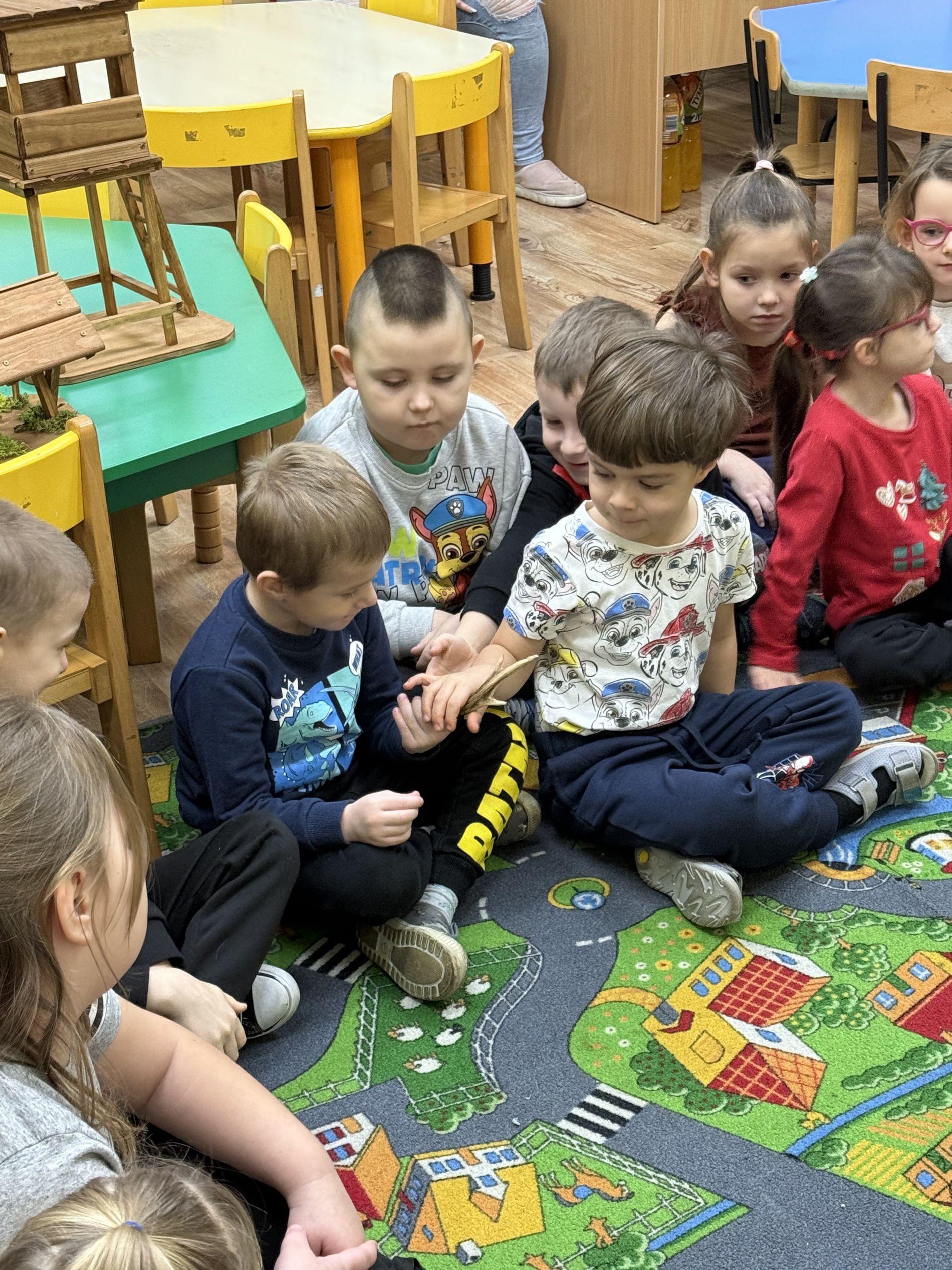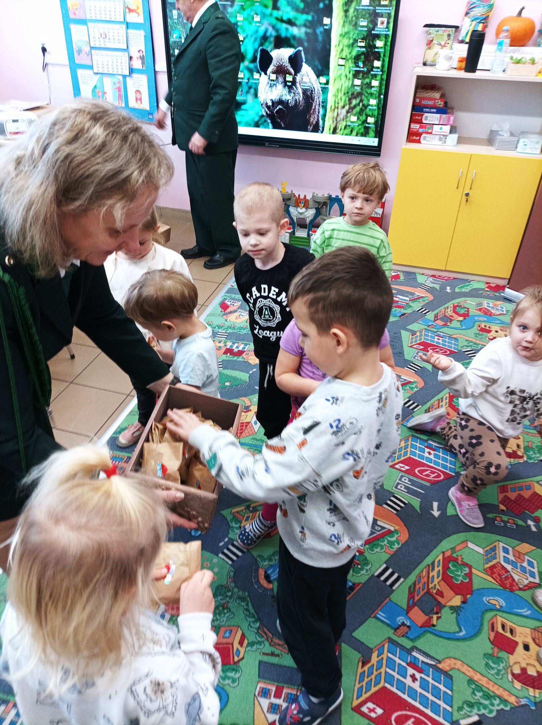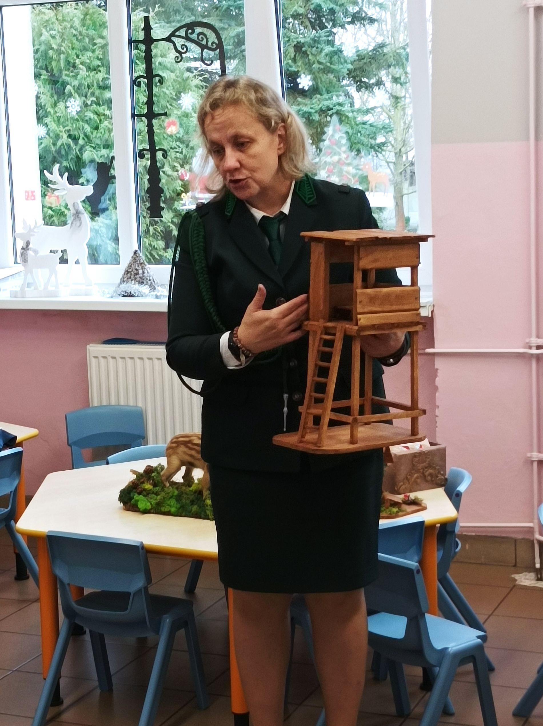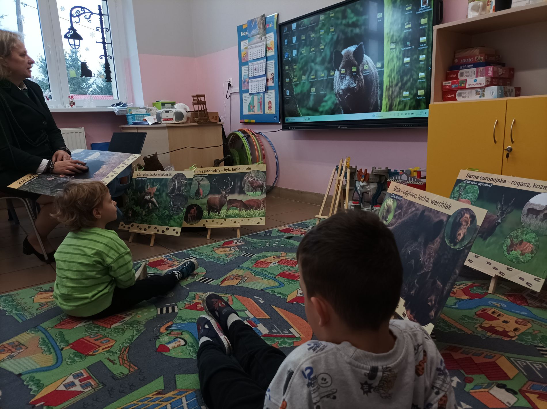 Podczas zajęć przedszkolaki oglądały plansze przedstawiające różne zwierzęta oraz słuchały interesujących opowieści na ich temat. Miały również okazję poznać poroża charakterystyczne dla poszczególnych gatunków i dowiedzieć się, jak je nazywamy. Dużą atrakcją było także obejrzenie miniatur ambon i paśnika, które wzbudziły wśród dzieci wiele zaciekawienia.